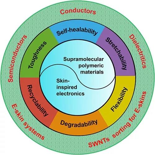 上海交通大学颜徐州研究员和美国斯坦福大学鲍哲南教授团队合作,系统地总结了基于超分子聚合物材料电子皮肤的研究进展。该综述重点介绍了将电学活性超分子聚合物材料应用于电子皮肤的三种主要元件(导体、半导体和介电层)的最新成就,包括设计原则、改进方法、主要优势及可实现的应用性能(获得抗撕裂、可拉伸、自修复和生物可降解)等等。总结了利用超分子聚合物的刺激响应性,可降解性和可回收性对高纯度sc-单壁碳纳米管进行分类最新报道,简要介绍了它们在可拉伸电子产品中的应用。汇总了将这些具有固有拉伸性和自愈性的关键电子元件集成到多功能电子皮肤系统的最新进展。