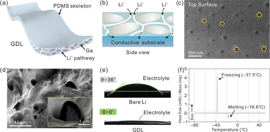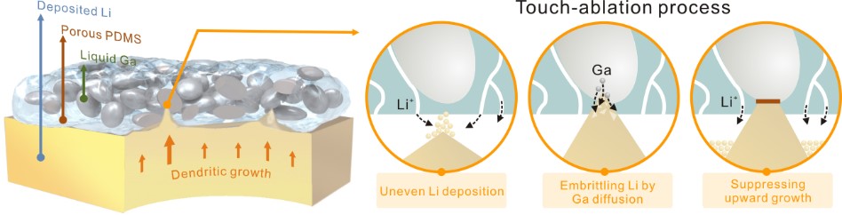 近期,武汉大学付磊课题组另辟蹊径,聚焦于典型的液态金属——镓(Ga),制备出Ga基复合膜作为锂金属负极的保护层。该组提出了接触−消融机制,当枝晶刺入保护层时,即可触发Ga发生独特的脆化现象,合金化接触区域,抑制枝晶向上生长的应力,从而实现均匀的锂沉积。通过精心设计和优化膜结构,将Ga液滴限域于分级多孔的聚二甲基硅氧烷(PDMS)膜中,仅2 μm的膜厚实现Ga的稳定过冷态(熔点降低至–16.6oC),使其在长循环中保持液态性质。同时,PDMS的电绝缘性避免Ga参与电化学反应,而多孔通道确保了锂离子的快速传输,提高电解液浸润性(图1)。