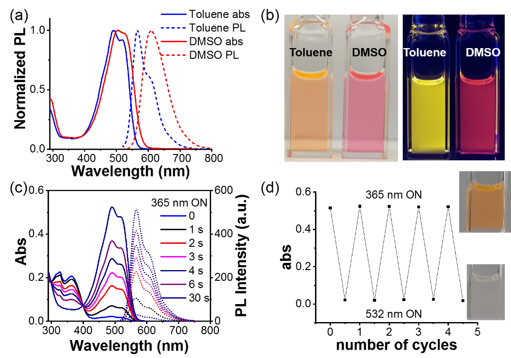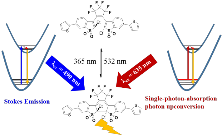 国家纳米科学中心段鹏飞课题组发现一类新型的具有单光子吸收上转换发光性能的化合物:光开关型发光二芳基乙烯。这类化合物可以实现紫外/可见光调控的闭环/开环反应,在闭环状态具有高效的发光性能。同时发现闭环状态分子具有活跃的基态高振动能级,可以实现基态高振动能级到激发态的跃迁,从而发出高能量的光子,可以真正意义上实现单一光子吸收的上转换发光。
