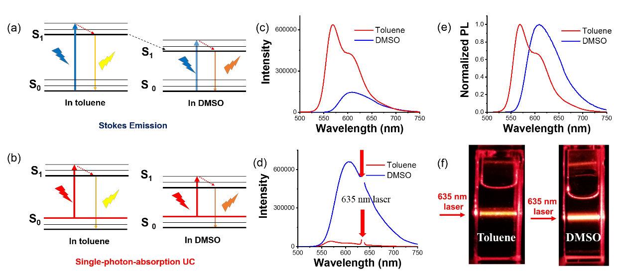 研究人员通过不同溶剂中的上转换发光对照进一步探讨了单光子吸收上转换发光的机理(图5)。由于这类材料具有分子内电荷转移的性质,随着溶剂极性的增大,其发光峰红移并且发光效率显著降低。作者比较了甲苯和二甲基亚砜(DMSO)作为溶剂时的发光情况。研究发现使用360 nm激光激发时,甲苯溶液的发光要强于DMSO。由于甲苯和DMSO溶液在360 nm处具有相似的吸光系数,甲苯溶液强的发光是由于其更高的发光量子效率造成的。但是使用635 nm激光激发的时候,则DMSO溶液发光更强。这是由于在DMSO中,发光峰能级与激发波长之间的能级差变小了,从而使得上转换发光更容易发生。最后,作者通过参比法评价了上转换发光效率,得到了13%的上转换发光效率。