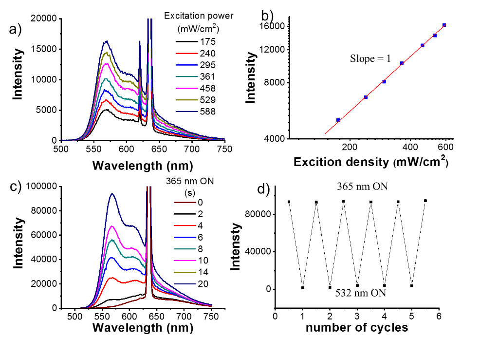 近期,国家纳米科学中心段鹏飞课题组发现一类新型的单光子吸收上转换发光的材料——光开关型发光二芳基乙烯。该类分子具有典型的光照开闭环性质,在开环状态不具有发光性质,而且在可见光区没有吸收。紫外光照可以促使开环态到闭环态的转变,在可见光产生较强的吸收,同时还表现出强的发光性质。同时,闭环态在可见光照射下,可以引发开环反应,实现发光的开关循环(图2)。研究人员发现,当使用635 nm激光器照射样品的时候,能够观察到黄色的发光,其发射光谱与普通发光光谱一致。这种长波长激发,短波长发射的现象,是典型的上转换发光(反斯托克斯发光)(图3)。