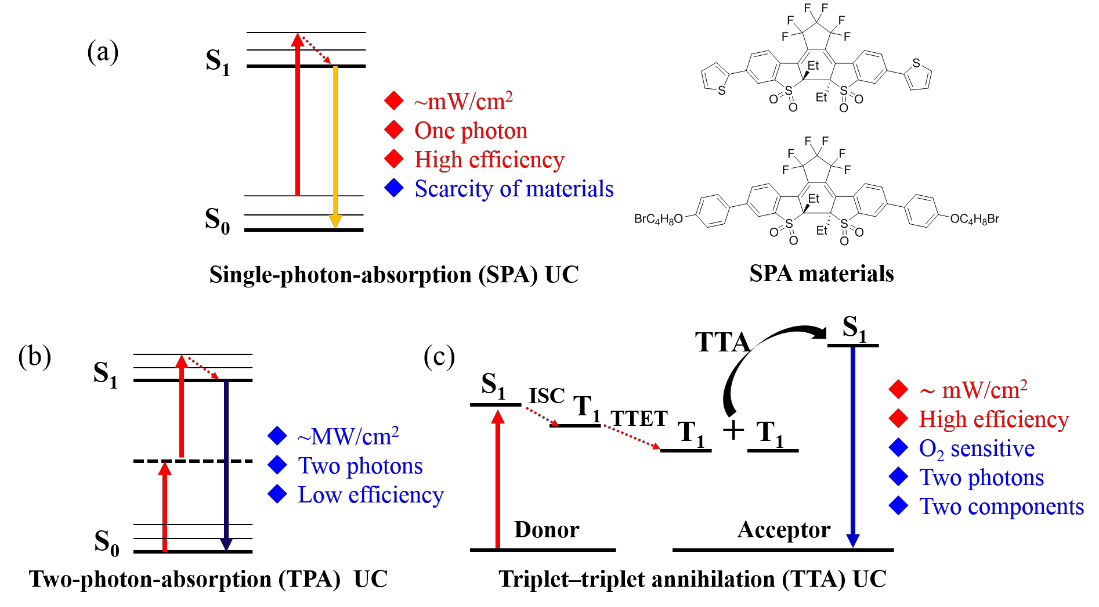 光子频率上转换(Photon upconversion, UC)是典型的光子融合过程,也叫反斯托克斯位移,通常是吸收低能量的两个或多个光子发出高能量短波长光的过程,即被长波长光激发时会发出短波长光,在太阳能电池、显示器设备、人工光合作用、生物成像领域有着潜在的应用。近年来,有机化合物体系中的光子频率上转换技术主要包括双光子吸收上转换(TPA),和基于三重态-三重态湮灭的上转换(TTA)等。在有机体系中,TPA上转换需要皮秒或飞秒激光器作为激发光源,激发光能量密度高达MW/cm2数量级,而且上转换效率很低(图1b);而TTA上转换具有激发光能量密度低、上转换效率高、以及激发和发射波长可调等优势,但是TTA上转换体系由于涉及到长寿命的三重态,对空气中的氧气非常敏感,往往需要严格除氧,并且固态TTA上转换效率一般都非常低(图1c)。